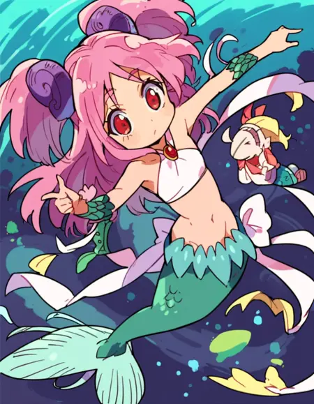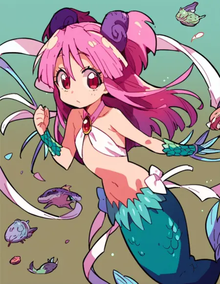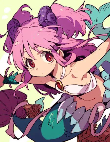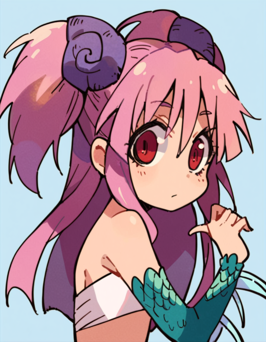 説明: ピンクの髪、モンスター娘、マーメイド、赤い目、サイドアップ、長い髪、ツインテール、うろこ