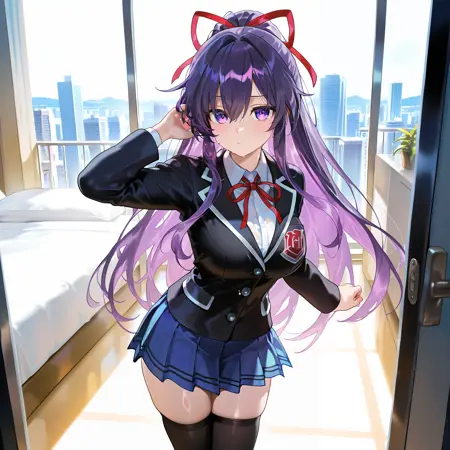 校服提示词: DALTohka,DAL校服,胸部,长发,紫色头发,发结,紫色眼睛,裙子,黑色长筒袜,夹克,校服,红色丝带,发带,西装外套,白衬衫,衬衫,黑色夹克,蓝色裙子