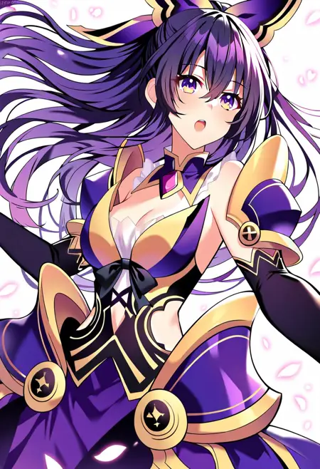 정신복 프롬프트: DALTohka, Tohka 아스트랄 드레스, 갑옷 드레스, 가슴, 보라색 머리, 가슴선, 보라색 눈, 드레스, 헤어 리본, 보라색 갑옷, 보라색 드레스, 긴 머리
