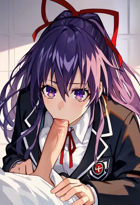 학교 규정복 프롬프트: DALTohka, DAL 학교 규정복, 가슴, 긴 머리, 보라색 머리, 헤어 리본, 보라색 눈, 치마, 검은 허벅지 스타킹, 재킷, 학교 규정복, 빨간 리본, 헤어 리본, 블레이저, 흰 셔츠, 셔츠, 검은 재킷, 파란 치마