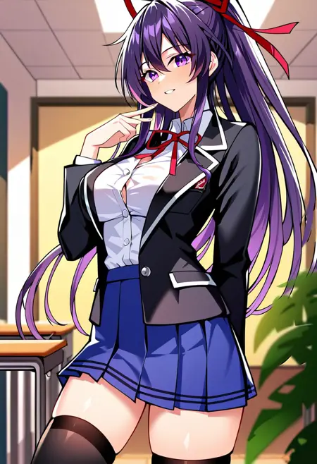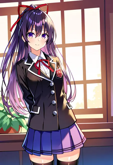 校服提示词: DALTohka,DAL校服,胸部,长发,紫色头发,发结,紫色眼睛,裙子,黑色长筒袜,夹克,校服,红色丝带,发带,西装外套,白衬衫,衬衫,黑色夹克,蓝色裙子
