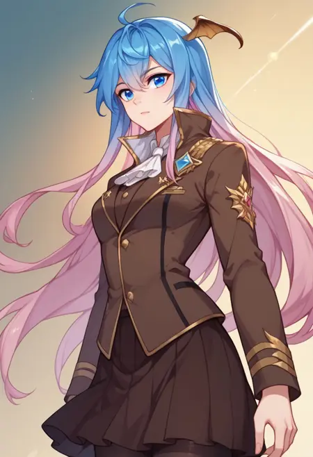 Wang qiu'er, blue eyes, gradient hair, blue hair, pink hair, head wings, ascot, high collar, military uniform, brown jacket, brown skirt, black thighhighs