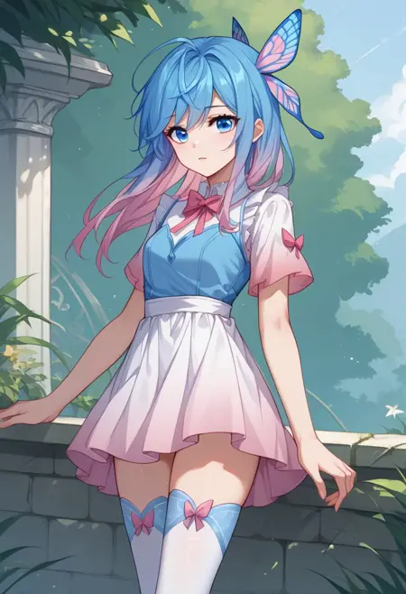 Wang dong'er, blue eyes, gradient hair, blue hair, pink hair, butterfly hair ornament, pink bow, long sleeves,jacket, white dress, blue dress, blue skirt, white thighhighs