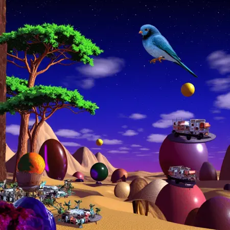 "A surreal, retro-futuristic digital artwork inspired by early CGI from the 1980s-90s, featuring a dreamlike, vibrant color palette with neon accents and a slightly pixelated, low-poly texture. The scene combines simple geometric shapes, metallic surfaces, and reflective textures, with stylized lighting that casts soft, glowing highlights. The overall tone is nostalgic and whimsical, capturing a sense of digital surrealism with floating, fantastical elements and a sci-fi aesthetic reminiscent of classic computer graphics. The colors are vivid, including electric blues, neon pinks, purples, and greens, with shadows and reflections that give a slightly jagged, imperfect quality typical of early 3D rendering. The background often has soft gradients, evoking a peaceful yet otherworldly atmosphere"
