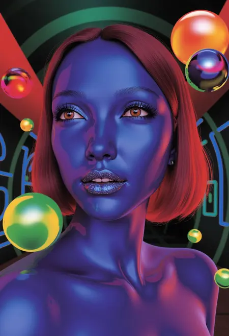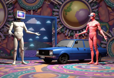 "A vibrant, surreal digital artwork inspired by retro-futuristic CGI and early 3D aesthetics, characterized by a highly stylized, dreamlike quality. The scene combines intricate, geometric shapes, bold structures, and layered elements, often featuring metallic and reflective textures. Lighting is dynamic, with neon and electric hues in shades of blue, pink, orange, and green, creating a visually intense and otherworldly feel. The background frequently includes swirling gradients, cosmic expanses, or ethereal color transitions, adding depth and a sense of endless space. Objects often appear suspended or in motion, contributing to a sense of dynamic surrealism. Shadows and reflections are rendered in a slightly jagged, low-poly style reminiscent of early computer graphics, with intricate patterns and glowing accents enhancing the sci-fi atmosphere. The overall tone is nostalgic yet futuristic, blending digital surrealism with a sense of retro-technology and fantastical elements."