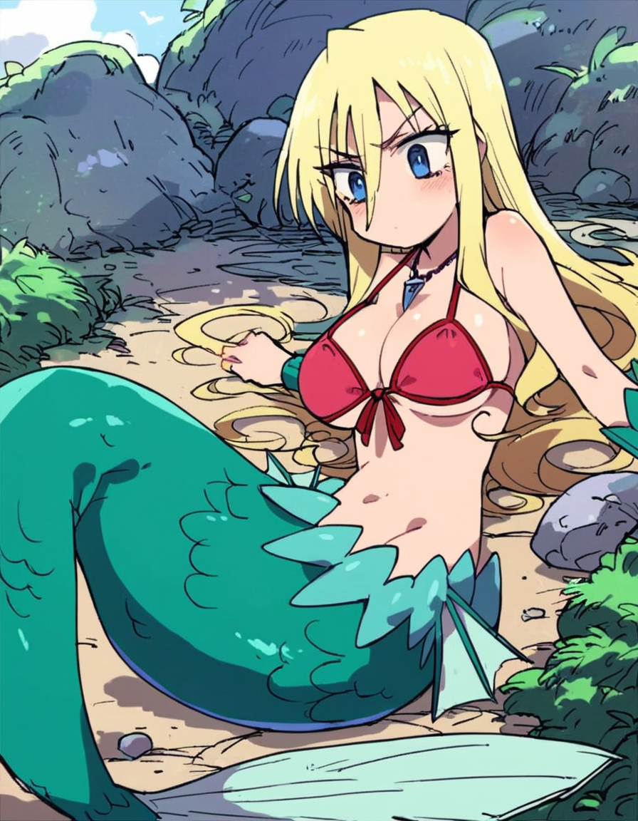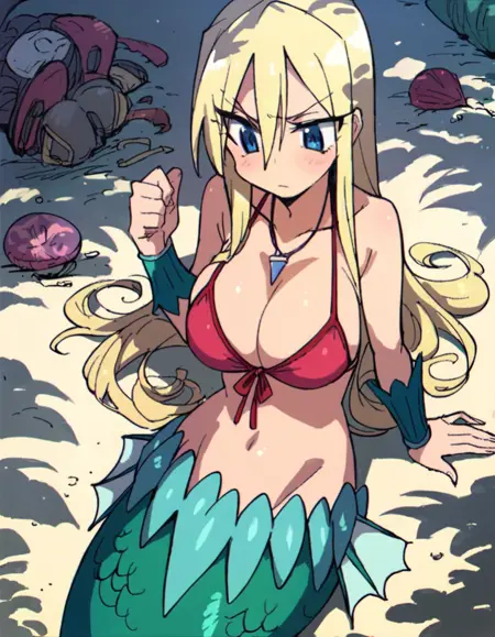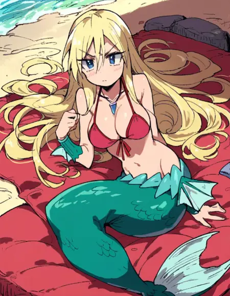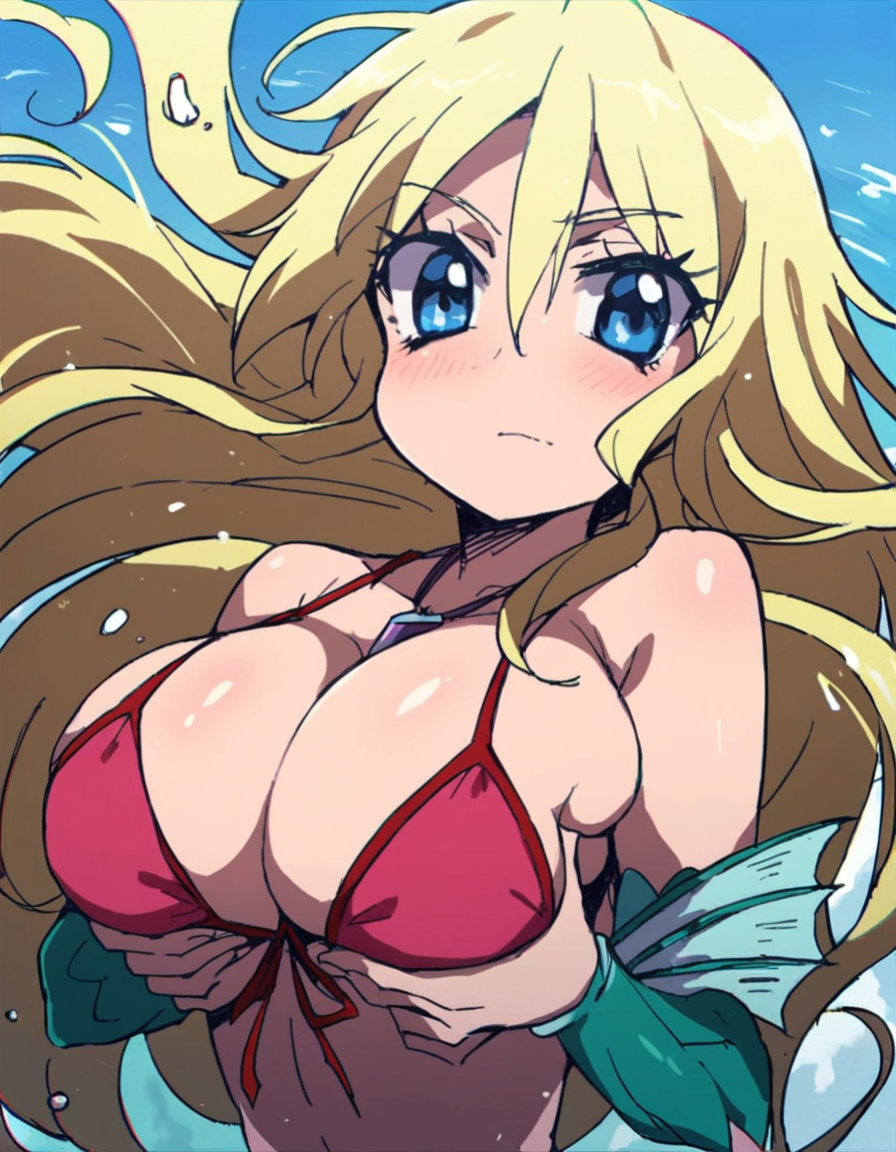説明: ブロンドの髪、長い髪、水着、ビキニ、青い目、人魚、大きい胸、ジュエリー、モンスター娘、ネックレス、フロントタイアップトップ