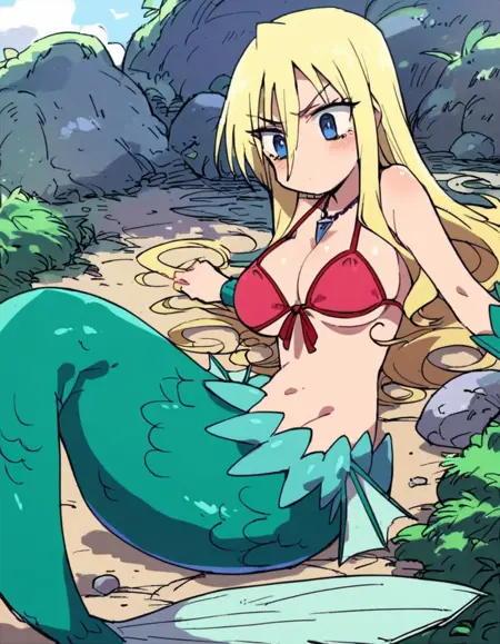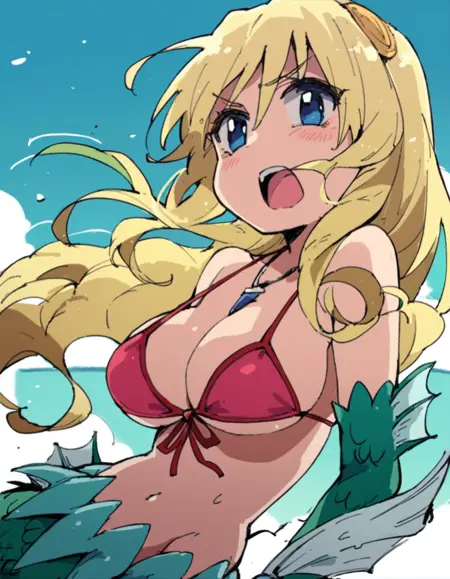 설명: 금발, 긴 머리, 수영복, 비키니, 파란 눈, 인어, 큰 가슴, 보석, 몬스터 걸, 목걸이, 앞면 매듭 상의
