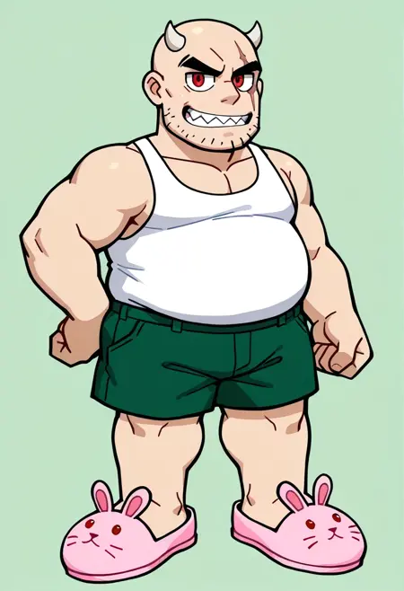 BraxtonSML, 1boy, overweight, fair skin, red eyes, sharp teeth, slight stubble, white horns on head, scar on left eye, white tank-top, dark green shorts, pink bunny slipper, bits of facial hair, bald,