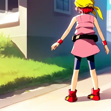 Prompt: Karin_CR, ahoge, yellow bandana, bandana, red hair, short hair, parted bangs, sidelocks, dress, pink dress, belt, wristband, bike shorts, shoes (her eye color is all over the place. Pink and dark green are both options.)