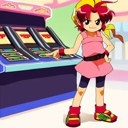 プロンプト: Karin_CR、ahoge、黄色のバンダナ、バンダナ、赤髪、短髪、分け目のある前髪、橫髪、ドレス、ピンクのドレス、ベルト、リストバンド、自転車用ショートパンツ、靴(彼女の目の色は曖昧です。ピンクと濃い緑の両方が選択肢です。)