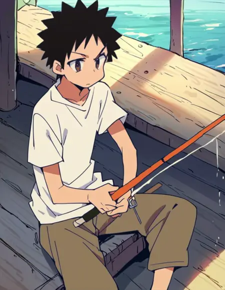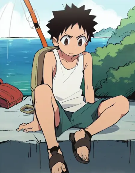 탱크탑, 학교 유니폼, 셔츠 등 여러 옷을 입고 있으며, 백팩, 낚시대(가끔 잡는 동작과 함께 사용됨) 등을 소지함.