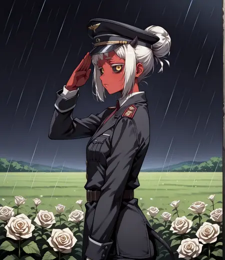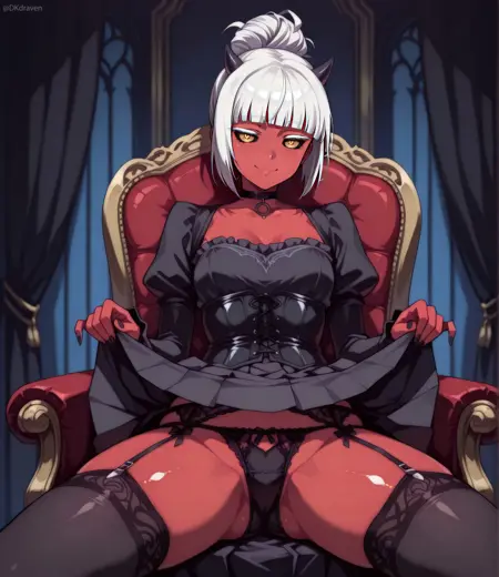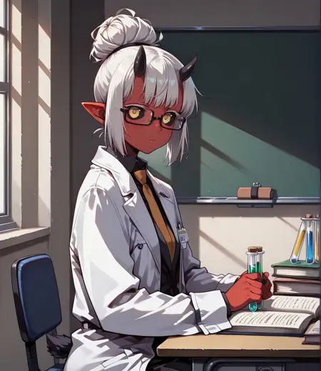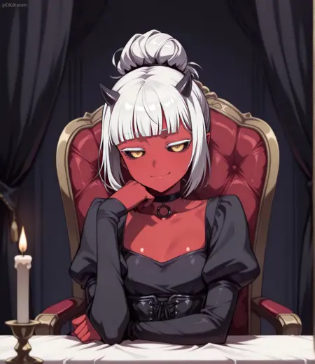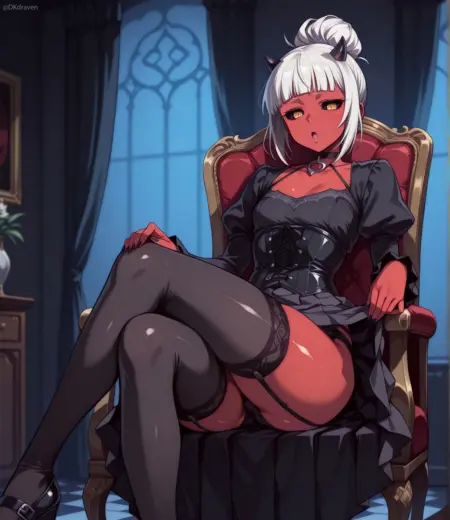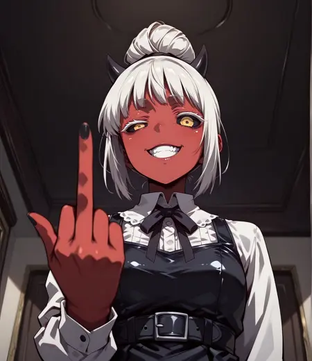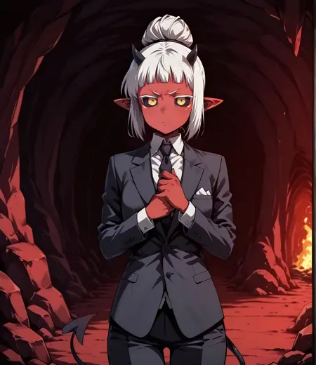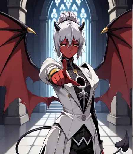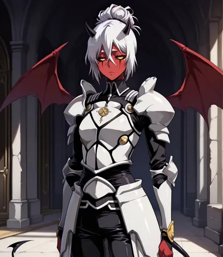 1girl, 10th floor merchant, golden eyes, white hair, short hair, blunt bangs, black sclera, single hair bun, red skin, tiny horns,