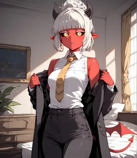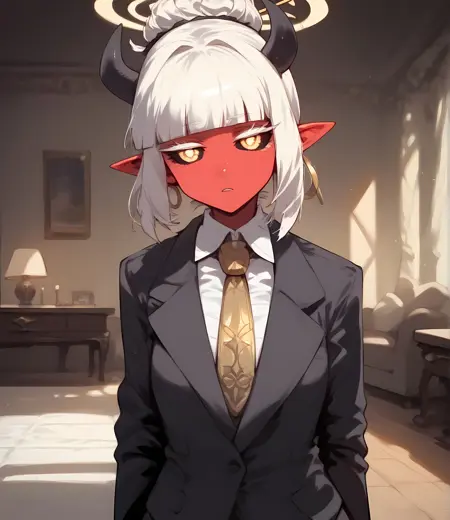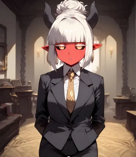 1girl, demon girl, red skin, black sclera, gold eyes, tiny horns, hair bun, single hair bun, blunt bangs, bob cut,