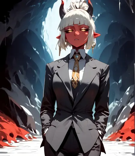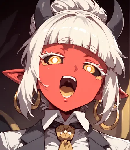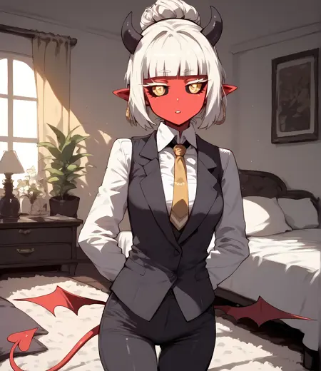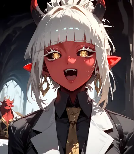 1girl, demon girl, red skin, black sclera, gold eyes, tiny horns, hair bun, single hair bun, blunt bangs, bob cut,