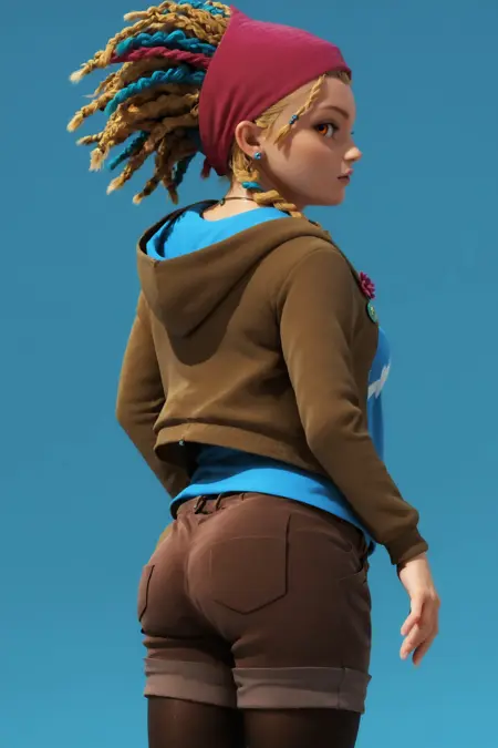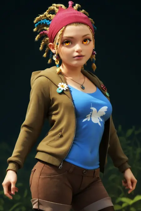 衣装トリガー:ジュエリー、ネックレス、バンダナ、ジャケット、バッジ、ショートパンツ、レッグウェア、ボタンバッジ、イヤリング、フード、花、ジャケットの花、青いシャツ、ロングスリーブ、ショートパンツ下のレッグウェア、フーディー、フードを下ろした状態、茶色のショートパンツ