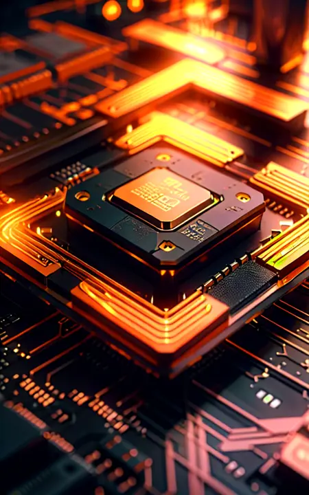 プロンプト:オレンジトーン、コンピュータチップ、製品クローズアップ、写真クローズアップ、シネマティックレンダリング、C4D、Blender、3D、超高精細テクスチャディテール、抵抗器、特殊効果、(中心に向かって収束する発光ライン:1.2)