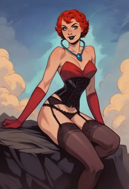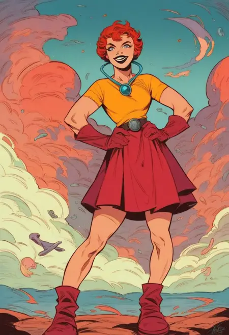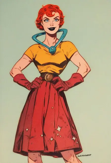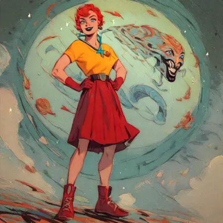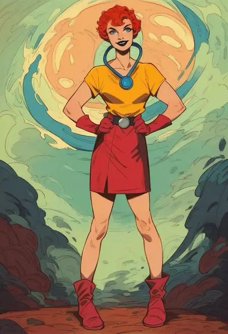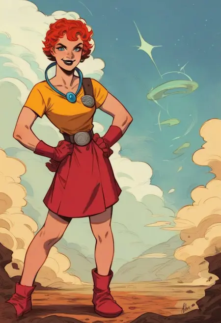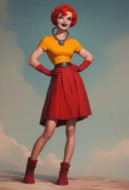 タグ: "Astra_gof, 短い赤髪, 青い瞳, 黄色のシャツ, ネックレス, 赤い手袋, 赤いスカート, ベルト, 黒いリップ, 赤い靴"。そして、ネックレスは確かにそのように首から浮かんでいるように意図されている。