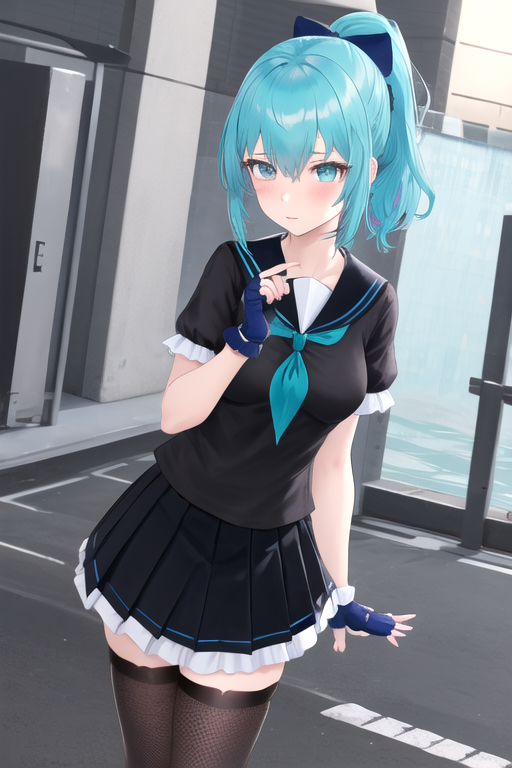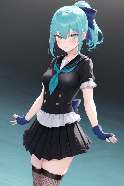 | 训练词汇 | VellaMoisiaSLVR, 1girl, solo, short hair, aqua eyes, pleated skirt, black shirt, black thighhighs, blue gloves, hair between eyes, medium breasts, ponytail, short sleeves, hair bow, frills, aqua hair, miniskirt, fingerless gloves, black skirt, sailor collar, neckerchief, blue bow, frilled sleeves, fishnet thighhighs已复制! |