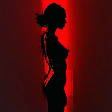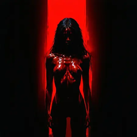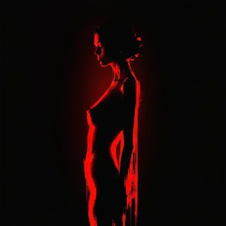 例のプロンプト:moody-dark, 1girl, solo, distortions, breasts, nipples, long hair, nude, upper body, from side, profile, two-tone background, small breasts, silhouette, gradient background, medium shot, red theme, woman, dark skin, closed eyes