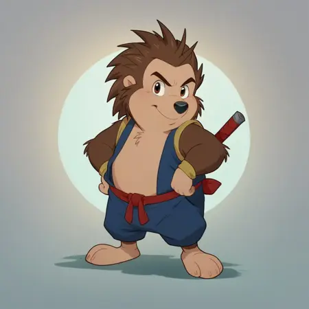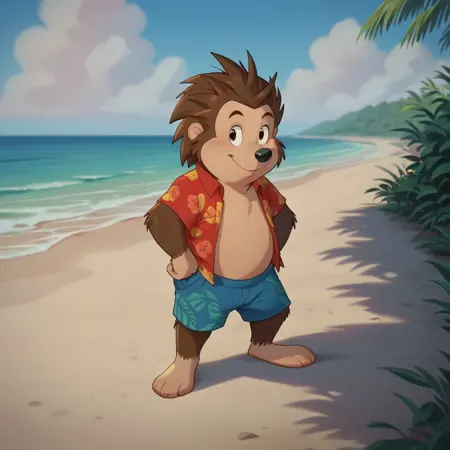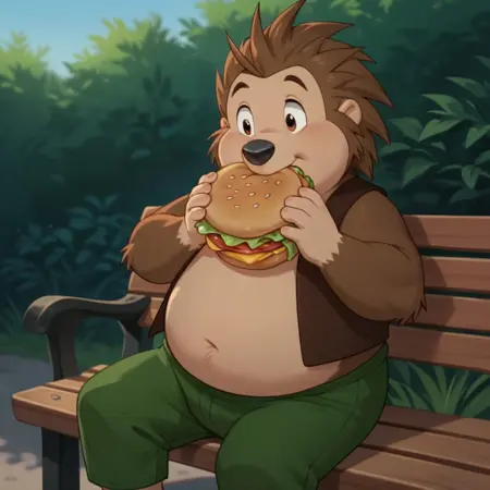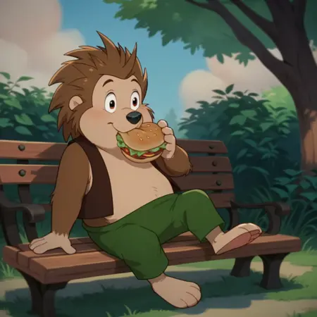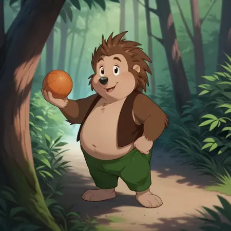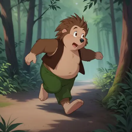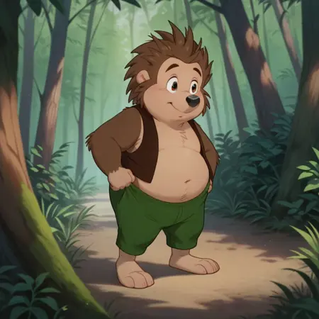 Russellouaf, young anthro, male, hedgehog, brown fur, green pants, brown vest,