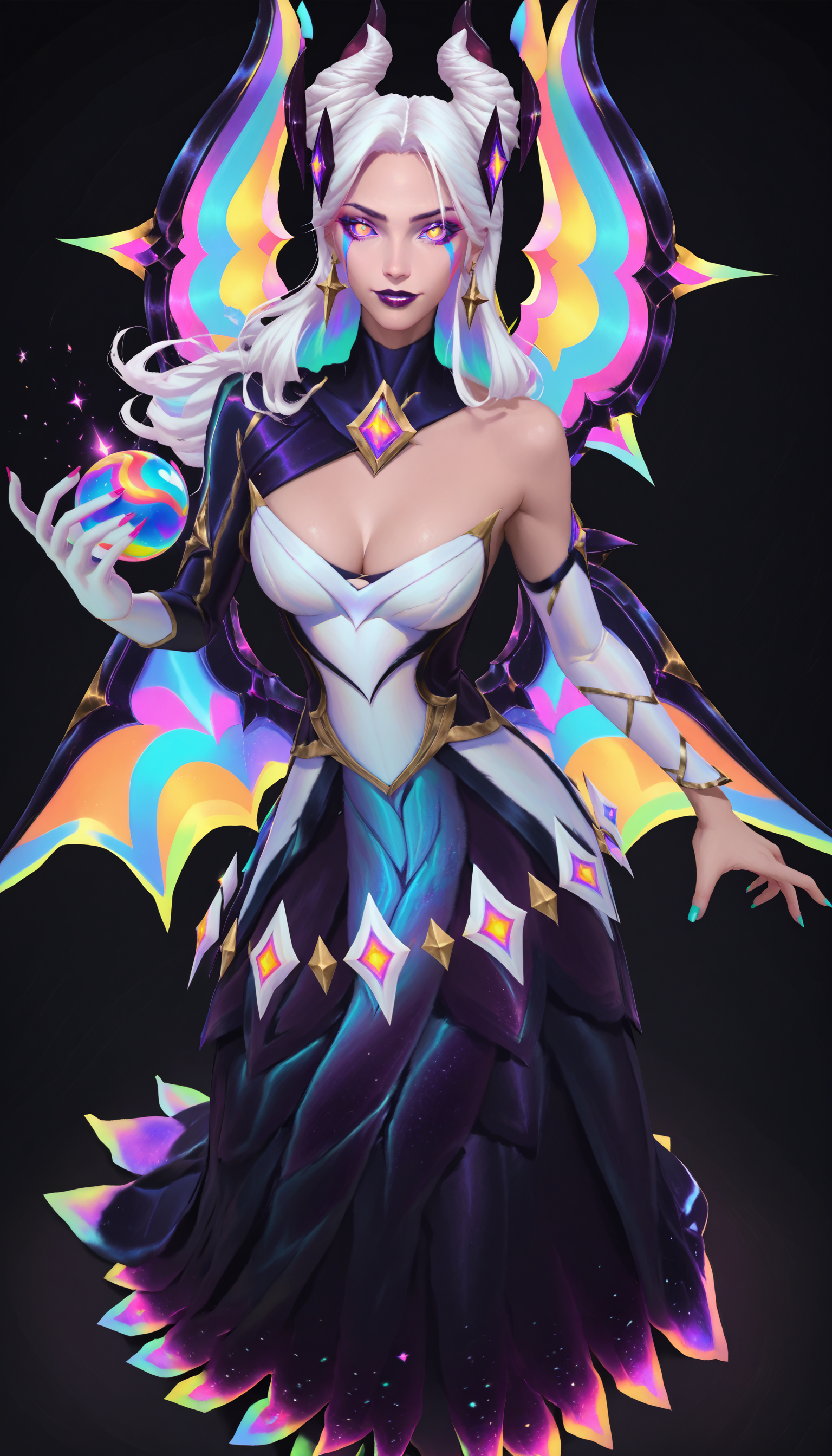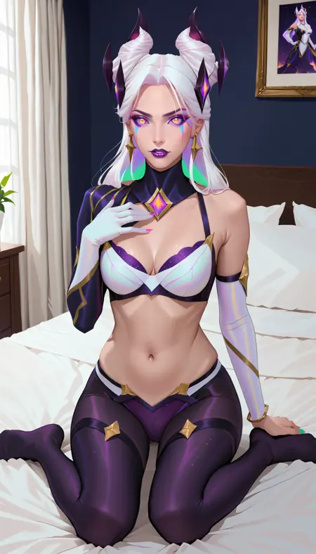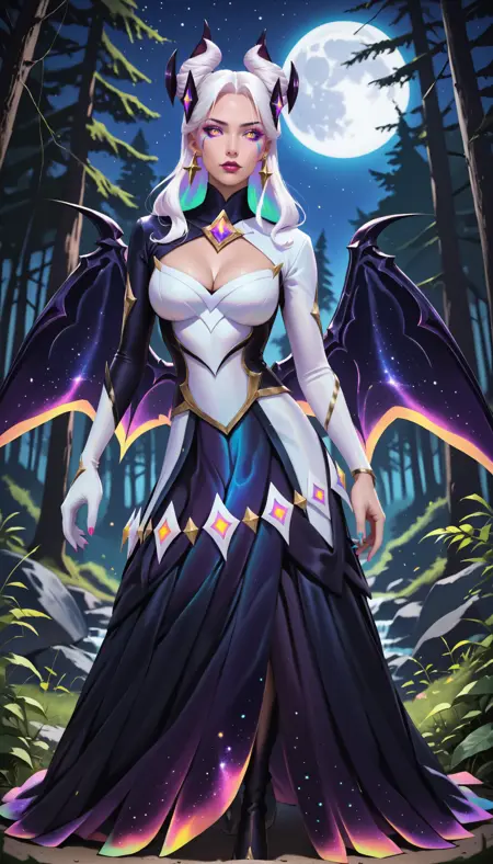star nemesis morgana, source_league_of_legends, white hair, long hair, breasts, looking at viewer, bangs, dress, cleavage, jewelry, medium breasts, earrings, boots, detached sleeves, horns, nail polish, colored sclera, pantyhose, single hand white glove, purple lipstick, makeup