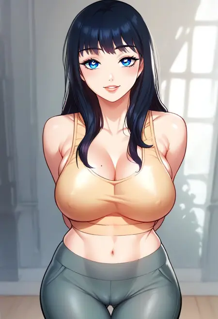 2. ((sexy yellow camisole, no bra, obscene cleavage, huge cleavage, midriff, sexy green yoga pants, ))