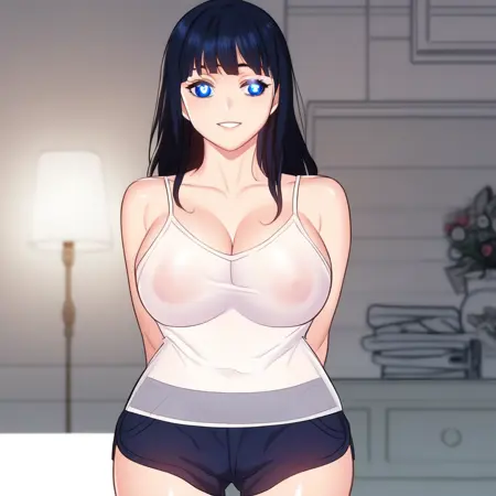 1. ((sexy sheer white camisole, no bra, obscene cleavage, huge cleavage, midriff, sexy dark blue shorts, )) sexy black shorts,
