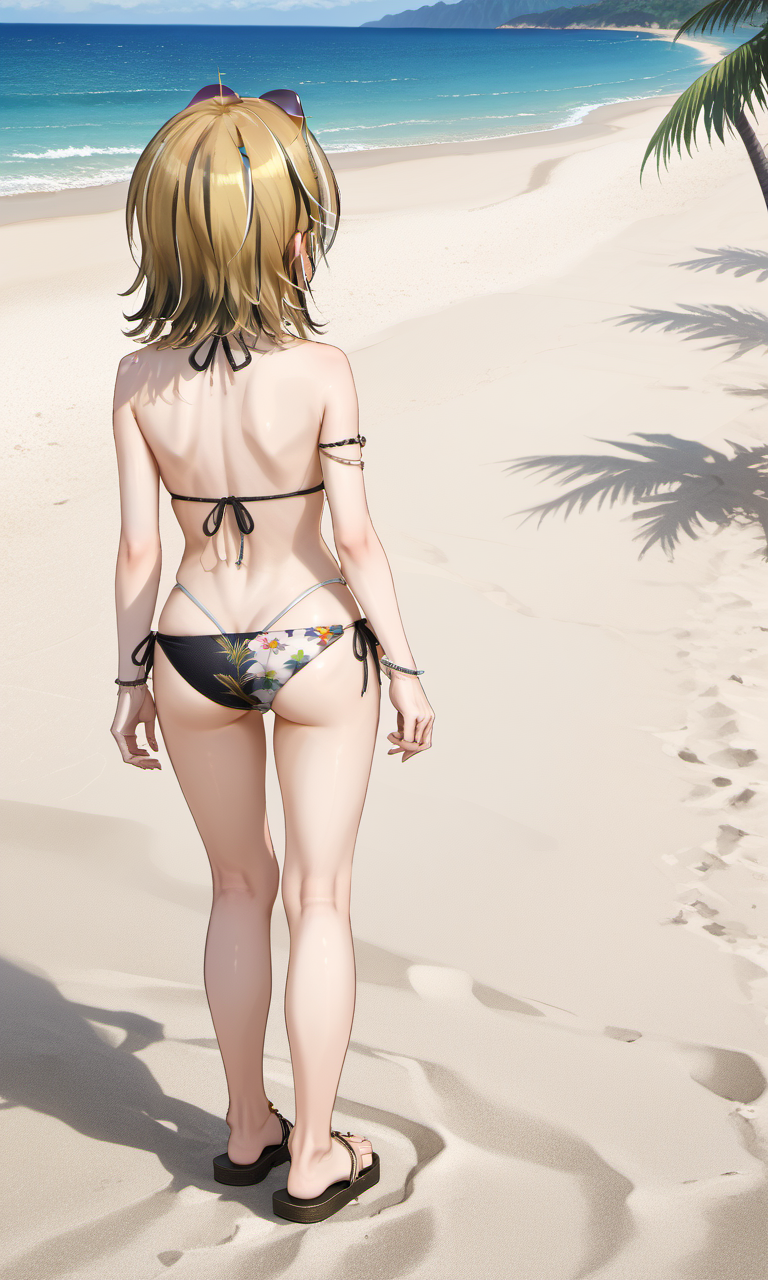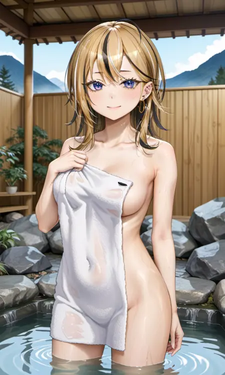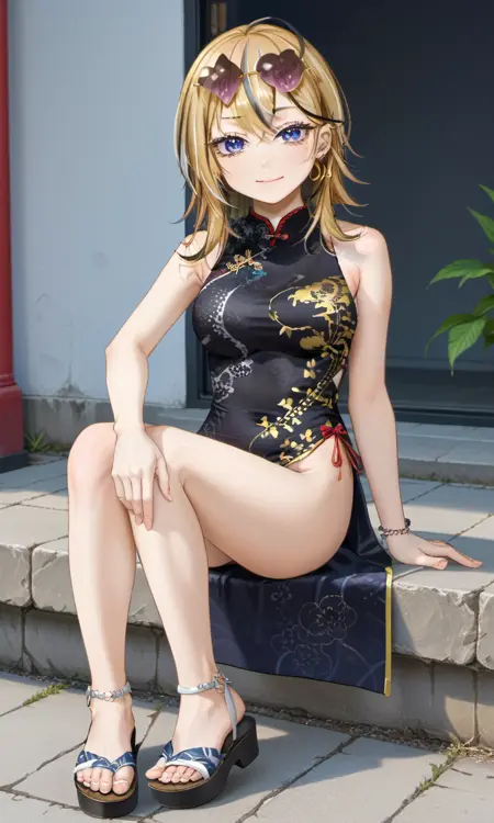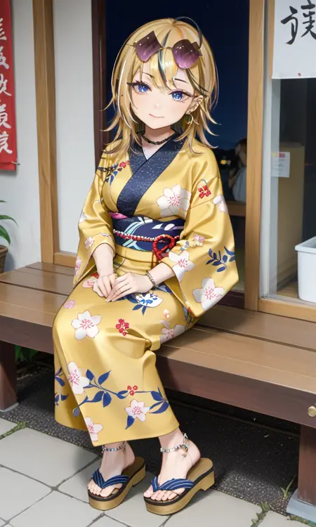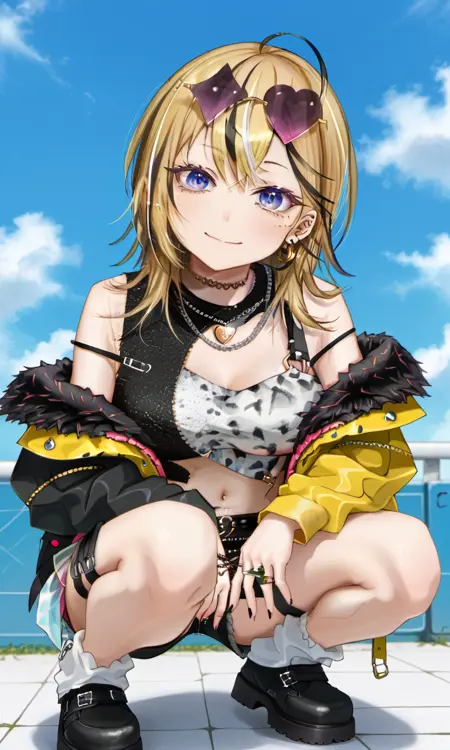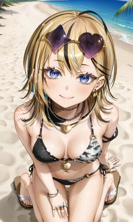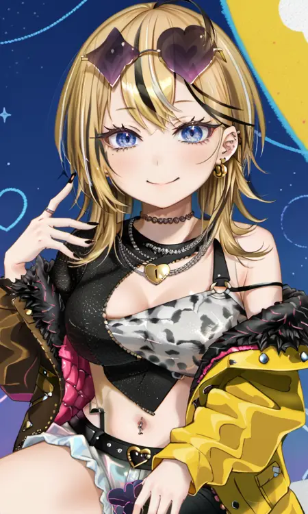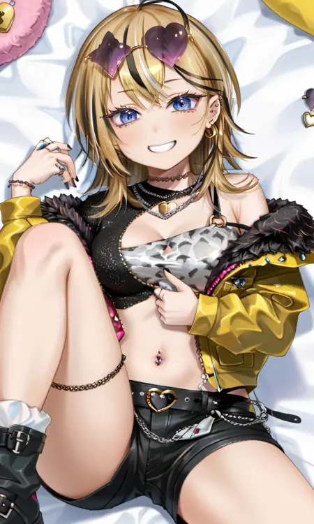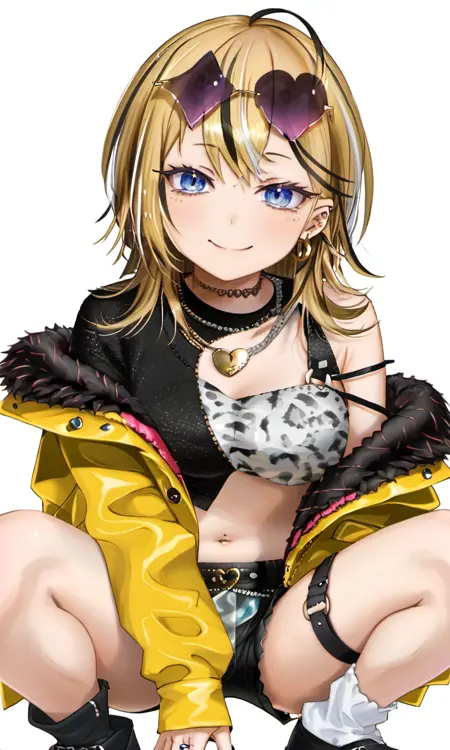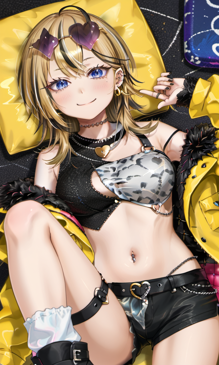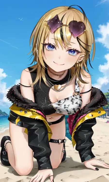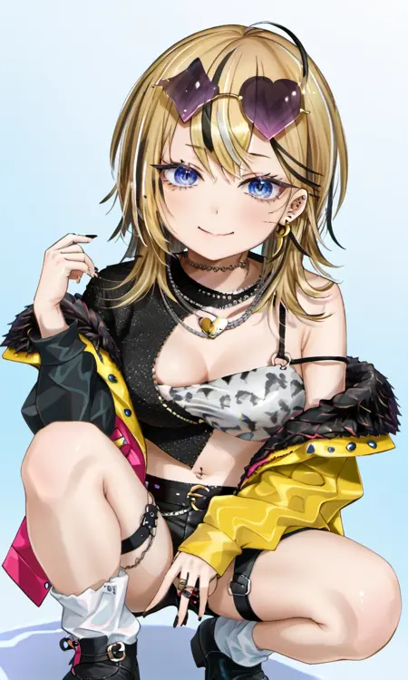 myaonarumi, blue eyes, blonde hair, multicolored hair, hoop earrings, ear piercing, eyewear on head, sunglasses, heart lock necklace,