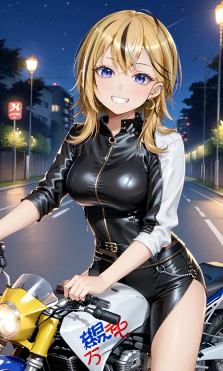 one shoulder top, jacket, navel, leather shorts, painted nails, thigh strap, chunky sole, black footwear,
