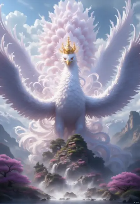 - 推荐语:神话生物!一只白孔雀栖息在岩石构造上,双翅完全展开。孔雀的羽毛呈现出鲜艳的粉红色,为画面增添了一抹亮色。鸟的头部装饰着一顶明亮的黄色冠冕