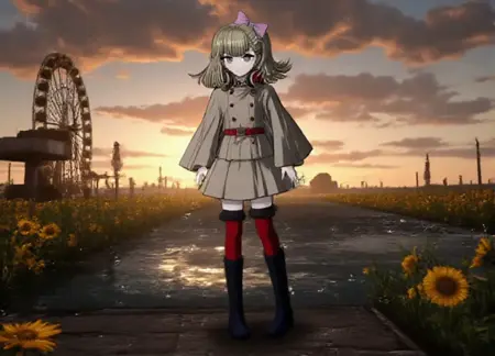 动漫风格(特别模仿游戏美术师小松崎璐的画风):"图像采用小松崎璐的动漫艺术风格。图像突出大而富有表现力的眼睛和夸张的发型,色彩丰富多样,细节层次极高,包括服装、配饰和背景元素上的复杂图案。图像融合了可爱迷人的元素与更黑暗、更具威胁性的主题,角色姿态充满动感与戏剧性,色彩鲜明且角色设计极具表现力。"