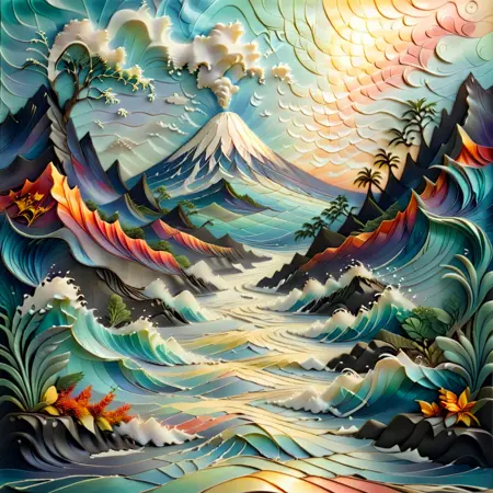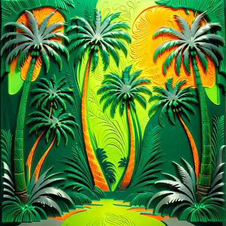 Tropical Paradise – “Palm trees swaying in the wind, tropical leaves in vibrant greens and oranges, a warm sun glowing from behind, layered shadows creating depth, artful and intricate detailing of each leaf and trunk.”