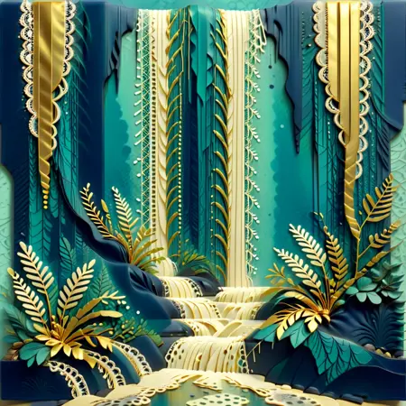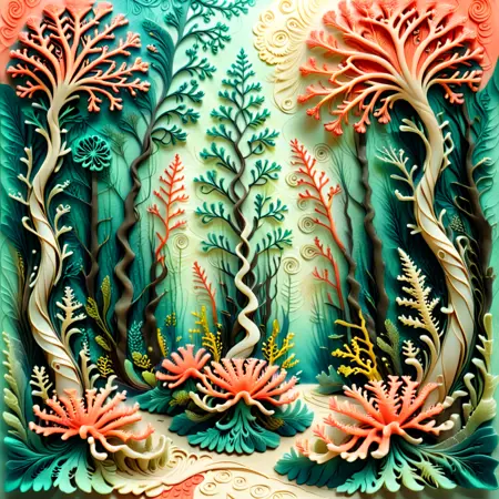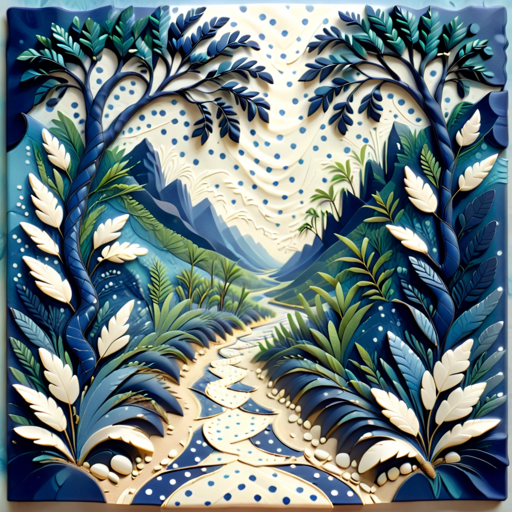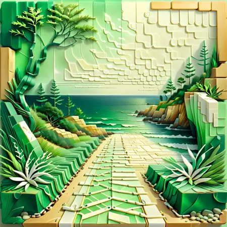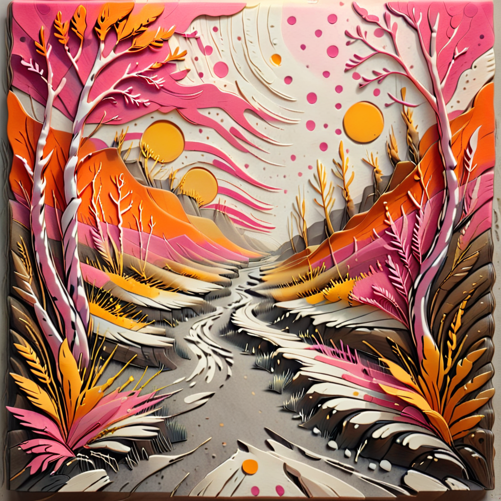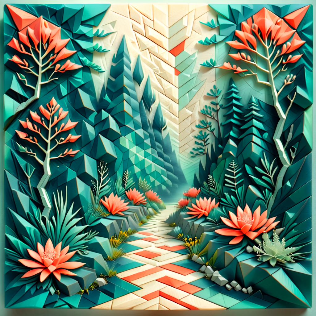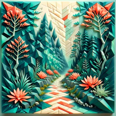 Fantasy Forest Pathway – “A winding path through an enchanted forest, trees with layered leaves in shades of teal and coral, intricate flora lining the path, softly glowing light filtering through the branches, intricate paper-cut style, hyper-detailed.”