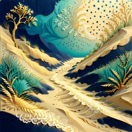 Desert Oasis at Dusk – “A desert landscape with rolling dunes, a river flowing through, lush foliage in gold and turquoise, a sky full of stars beginning to appear, vivid depth and layering in the scenery, intricate detail in each element.”
