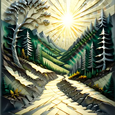 Mountain Sunrise Scene – “Sun rising over a serene mountain range, light rays spilling over detailed rock layers, lush green pines cascading down the slopes, golden highlights in the foreground, artfully layered effect, paper-cut style.”