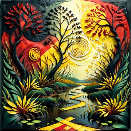 Ethereal Fantasy Swamp – “A surreal swamp landscape with twisting trees, vibrant red and yellow foliage, water reflecting the layered landscape, soft, glowing light, intricate depth and layering, capturing a magical, otherworldly feel.”