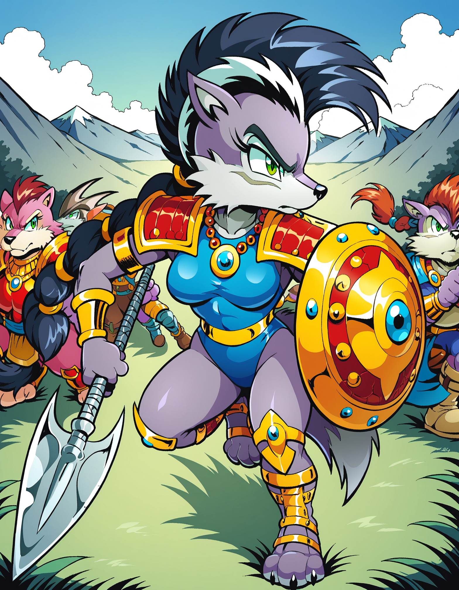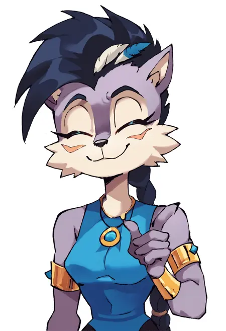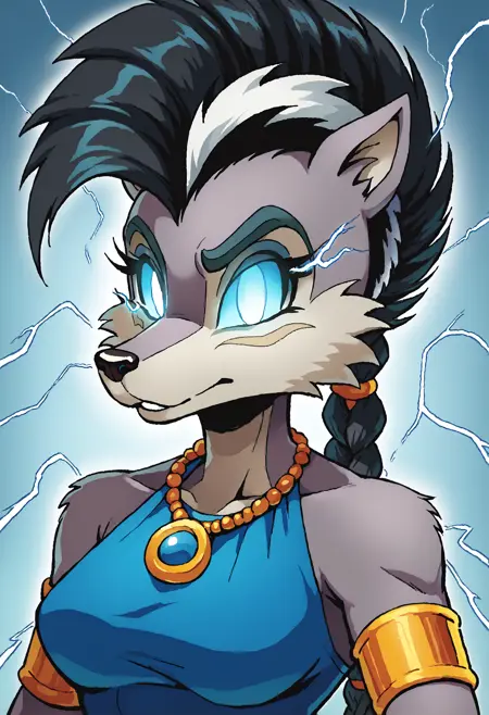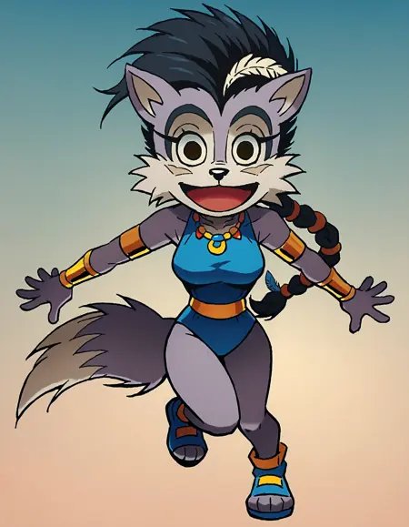 Tags: Lupe the wolf, anthro wolf, 1girl, mohawk, black hair, braided ponytail, blue leotard, armlet, necklace, feather hair ornament, blue eyes