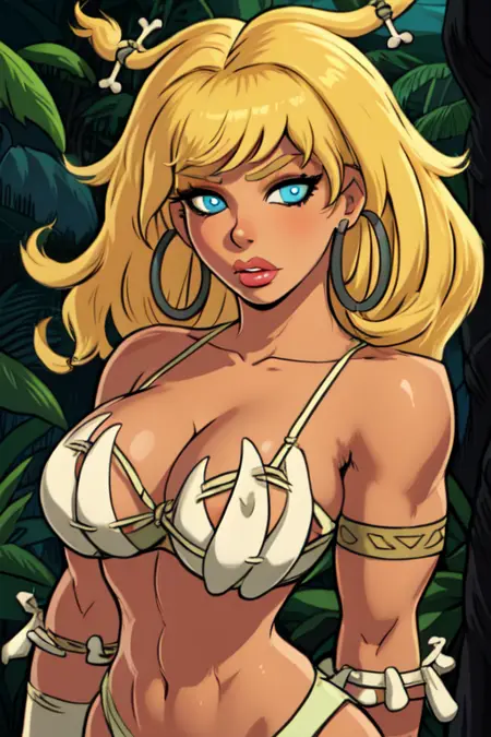 OrnAttire, tooth necklace, sandals, headband ,cleavage, underboob, torn crop top, underwear, arm bands,