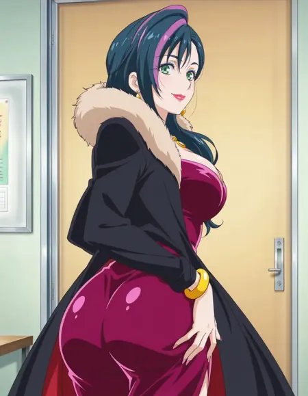score_9, score_8_up, score_7_up, anime screencap, solo,1girl, earrings, dress, multicolored hair, long hair, breasts, bracelet, makeup, necklace, lipstick, green eyes, coat, streaked hair, purple hair, fur trim, cleavage, black hair, pink hair, lora:papple:0.8