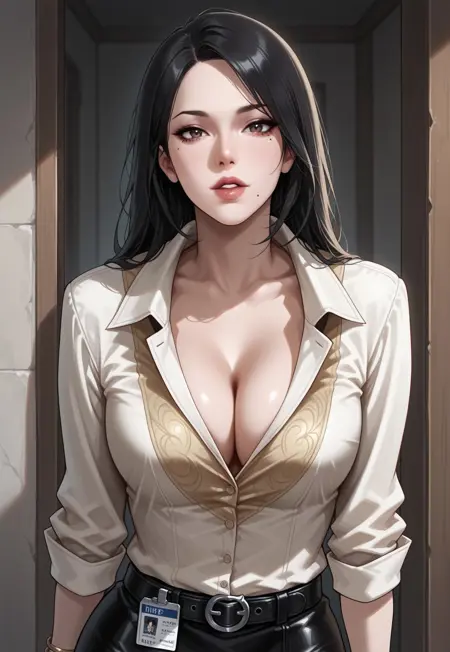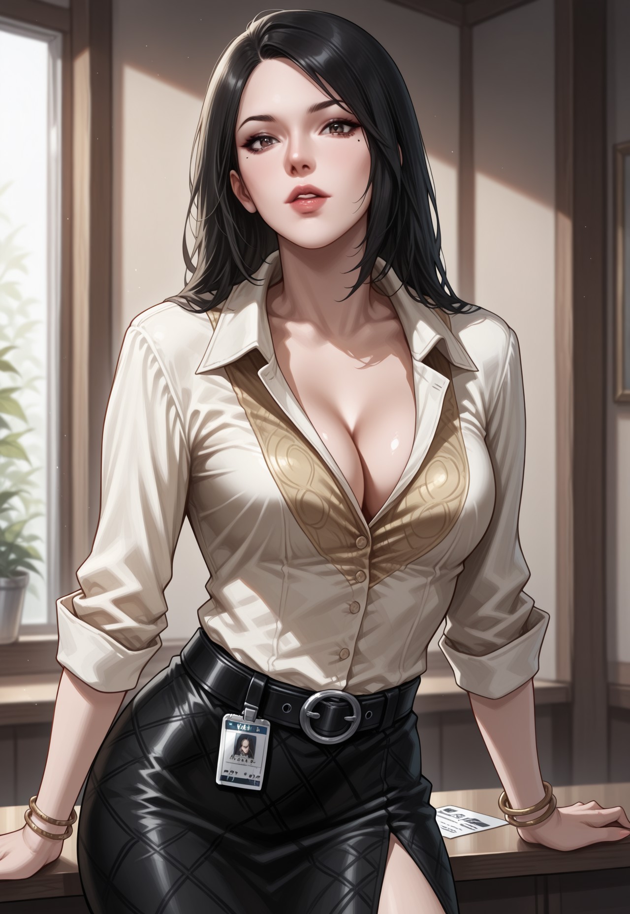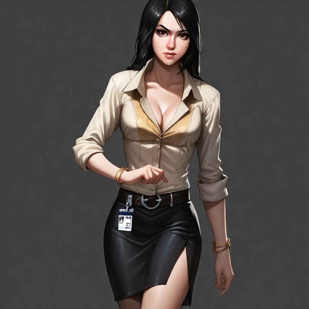 - ポロシャツ、胸元、袖をまくり上げ、ベルト、IDカード、スカート、サイドスリット、ブレスレット、ハイヒール,