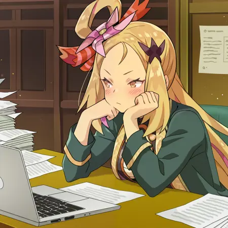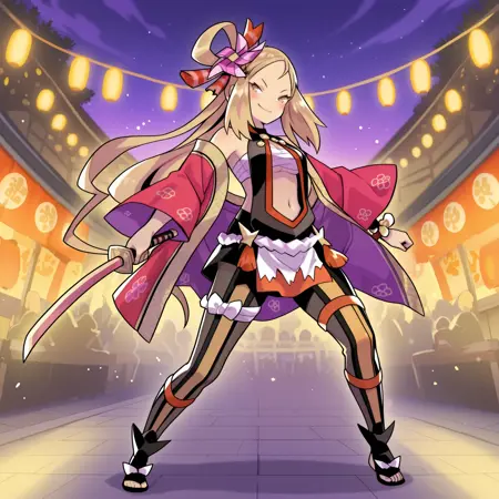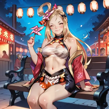 Trigger words: Natalie Dragalia, yellow eyes, blond hair, multicolored hair, hair rings, pinwheel, pinwheel on hair, ribbon, hair ribbon, bangs, sidelocks, bare shoulders, brooch, medium breasts, sarashi, wide sleeves, opened kimono, navel, sandals
