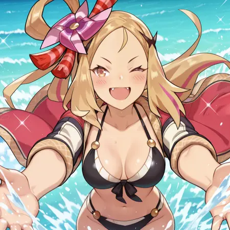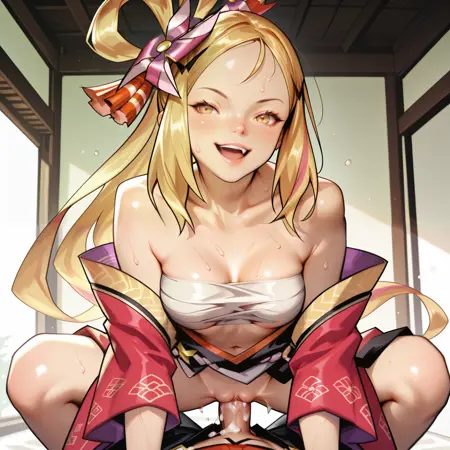 トリガー語: ナタリー・ドラガリア、黄色い目、金髪、多色の髪、髪輪、風車、髪に差した風車、リボン、髪リボン、前髪、横髪、肩出し、ブローチ、中程度の胸、絞り、広袖、開いた着物、へそ、砂長靴
