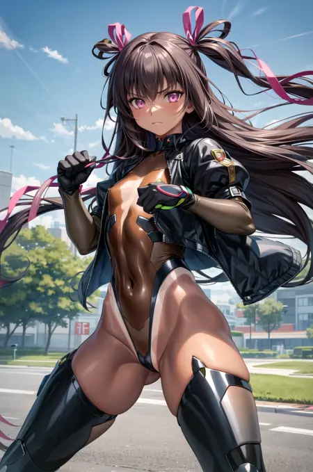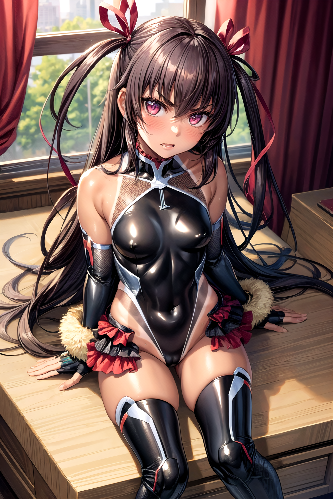 Taimaninスーツ - mizuki yukikaze, hair ribbon, black leotard, taimanin suit, one-piece tan, elbow gloves, fur trim, fingerless gloves, frilled leotard, thigh boots - ファーの trimming が気になる場合は重みを下げたり削除したりしてください。ネガティブプロンプトに「赤い手袋」「赤いレッグウォーマー」「胸元」を追加すると、正確性が向上します。