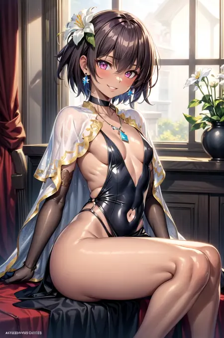 アダルトイブニングドレス - mizuki yukikaze、ショートヘア、ヘアフローレット、ホワイトカペレット、ブラックチョーカー、イヤリング、ネックレス、ブラックドレス、深く開いた襟、肘手袋、ブラウン手袋、へそカットアウト、タンガ、ブレスレット - こちらは品質が低めなので、Loraの重みを下げると助けになる。