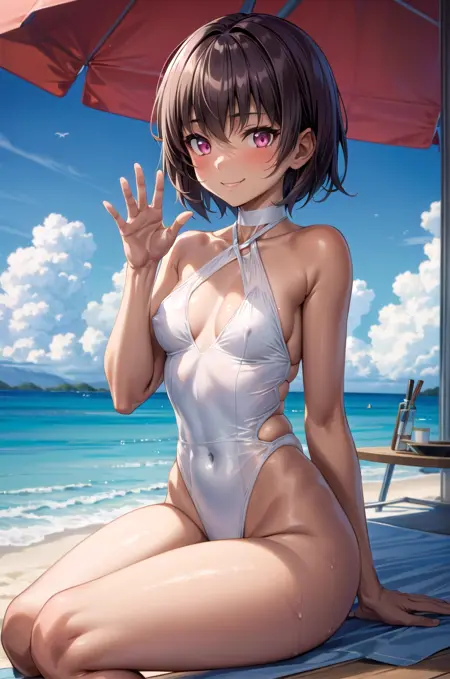 透明水着 - mizuki yukikaze, hair ribbon, white one-piece swimsuit, one-piece tan, see-through, covered nipples - ここではLoRAの重みを下げると効果的だと思います。