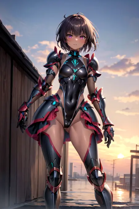 アダルトバージョン - mizuki yukikaze、ショートヘア、タイマニンスーツ、ブラックレオタード、フィッシュネツ、肘手袋、バンブレース、アーマードスカート、太ももブーツ