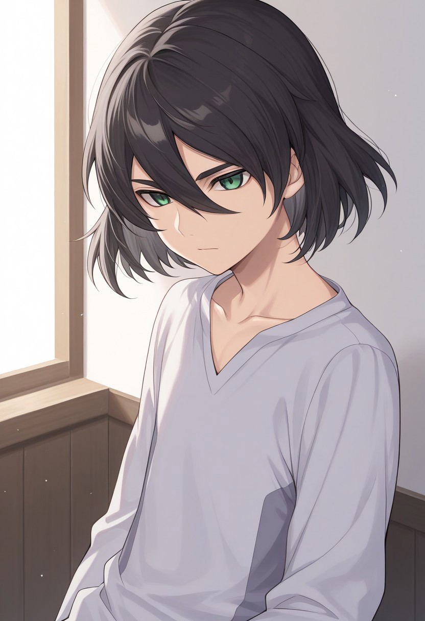 harukizu, 1boy, male focus, solo, black hair, hair between eyes, green eyes, pajama, shirt, grey shirt, long sleeves, pants, grey pants,