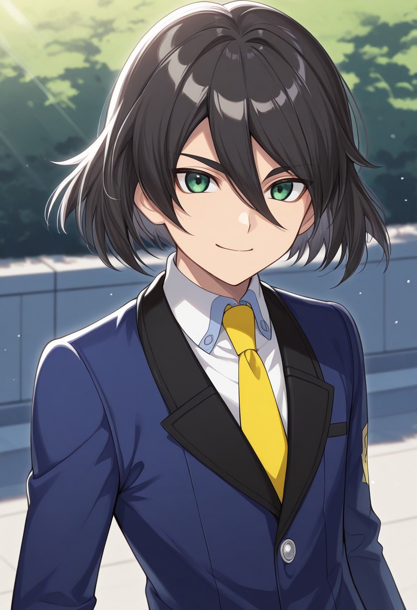 harukizu, 1boy, male focus, solo, black hair, hair between eyes, green eyes, school uniform, jacket, blue jacket, long sleeves, shirt, white shirt, collared shirt, necktie, yellow necktie, pants, blue pants, shoes,