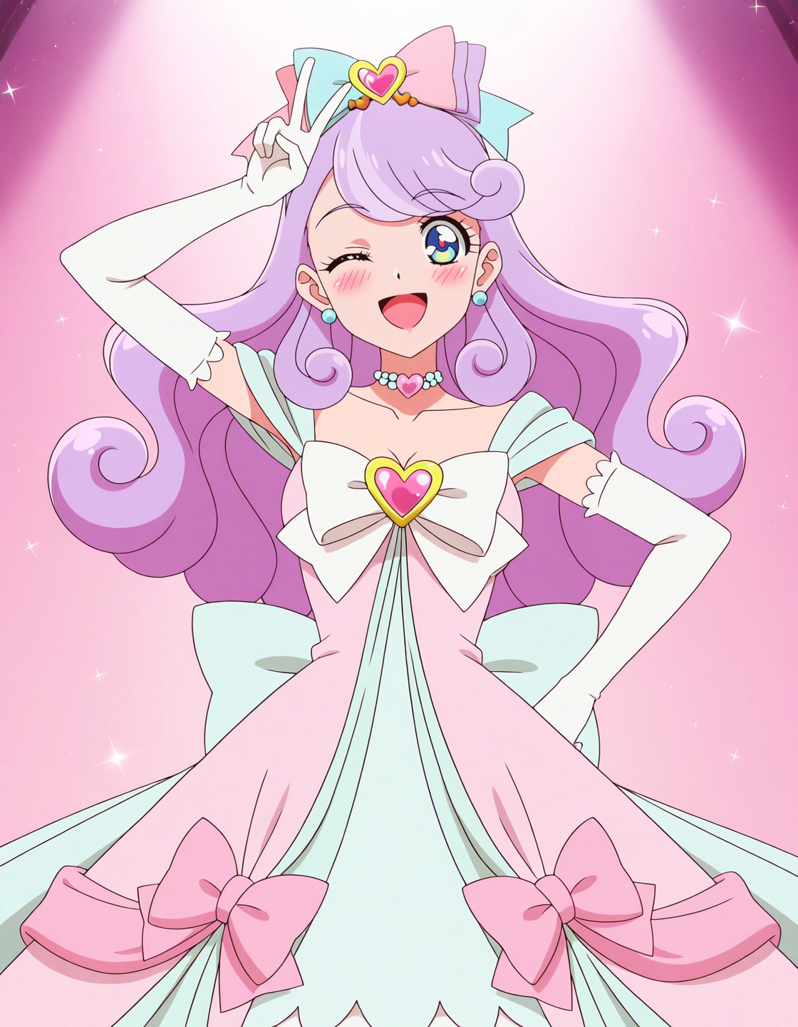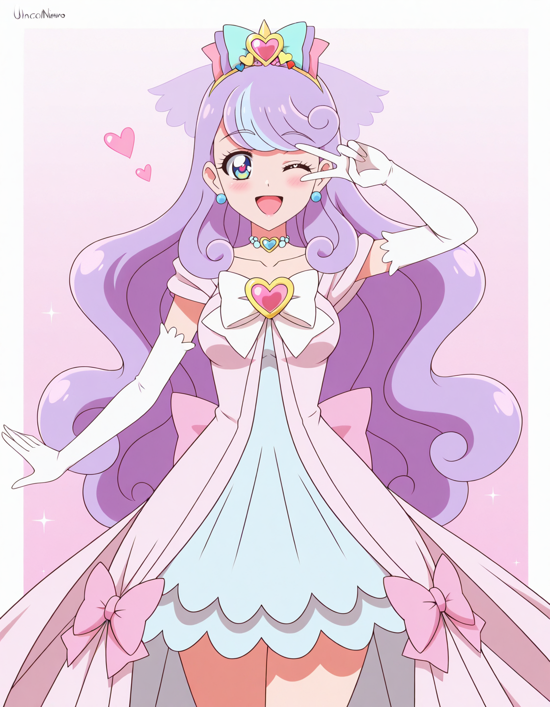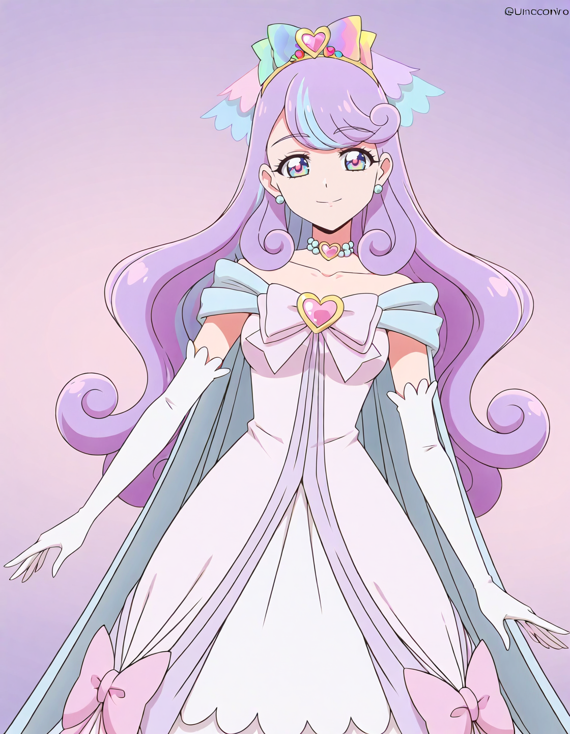 score_9, score_8_up, score_7_up, 动画截图, 单人, 1女孩, unicornniko, 饰品, 长发, 手套, 耳环, 肘部手套, 蝴蝶结, 白色手套, 心形胸针, 锁骨, 发饰, 连衣裙,lora:unicornniko:0.8