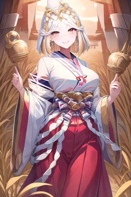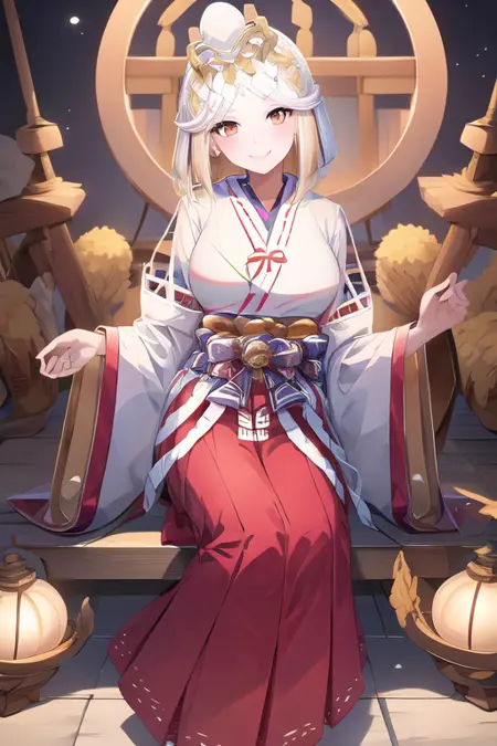 red hakama skirt, purple sash, purple bow, jingle bells, japanese clothes, wide sleeves, red eyes, white hair, short hair, hair over shoulder, hair ornament